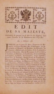 de Sa Majesté, ordonnant de parquer ou de détruire les sangliers dans toute l’étendue de sa domination aux Pays-Bas. Mons, M. J. Wilmet, 1781. In-4, 20 x 32 cm, 4 pp., percaline bordeaux (cartonnage postérieur). Édition originale. Rare.