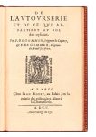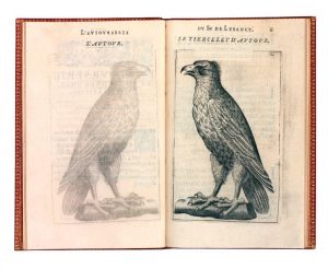 De l’autourserie et de ce qui appartient au vol des oyseaux. Paris, Jean Houzé, 1605. In-8, 10,5 x 16,5 cm, 34 ff. chiffrés, 2 ff. non chiffrés, maroquin janséniste rouge, dos à nerfs, dentelle intérieure dorée, tranches dorées (Huser). Seconde édition « également fort rare » (Thiébaud). Illustré d’une figure gravée sur cuivre à pleine page. L’emplacement de la seconde figure est resté vierge, comme le signale Thiébaud. La figure présente varie selon les exemplaires : dans cet exemplaire, c’est le tiercelet d’amour (feuillet 6r), comme dans celui de la réserve de la BnF. Dans l’exemplaire de la British Library, c’est l’autour (feuillet 5v).