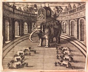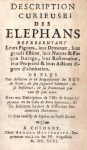 Description curieuse des éléphans… Cologne, Arnold Metternich, 1696. In-16, 7 x 12 cm, 72 pp., frontispice et 6 pl., vélin ivoire (reliure moderne). Description des éléphants d’Asie et d’Afrique, présentation de la cour du roi de Siam, description des Hottentots d’Afrique australe. Illustré de 7 planches gravées repliées.