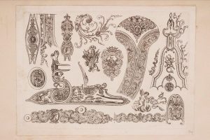 Nouveau desseins d’arquebuseries. Paris, Marteau, 1730. In-folio, 25 x 35,5 cm, 12 pl. montées sur papier fort, demi-chagrin rouge à coins, dos à nerfs, chiffre doré en queue (reliure de la fin du XIXe siècle). Belle suite, très rare, de modèles de décors d’armes à feu.
