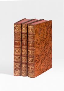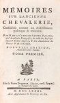 Mémoires sur l’ancienne chevalerie… Paris, Veuve Duchesne, 1781. 3 volumes in-12, 9,5 x 16,5 cm, XII + 392 pp. & 2 ff., 318 pp., 1 f. & XIV pp., 1 f., 456 pp., veau fauve marbré, dos à nerfs ornés de motifs dorés (reliure de l’époque). Édition originale de 1759, avec titre de relais pour les deux premiers volumes. Le troisième volume (1781) contient les Mémoires historiques sur la chasse… (290 pages)