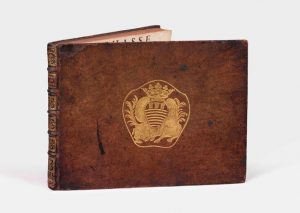 La chasse du cerf, divertissement chanté devant Sa Majesté à Fontainebleau le 25me d’août 1708… Paris, Christophe Ballard, 1709. In-8 oblong, 24,5 x 19 cm, 2 ff., 180 + 8 pp., veau brun moucheté, armes dorées sur le premier plat, phylactère doré sur le second plat, dos à nerfs orné de motifs dorés (reliure de l’époque). Unique édition rare dédiée à la princesse de Conti. Le texte de Serré de Rieux est mis en musique par Morin, ordinaire de la musique du duc d’Orléans.