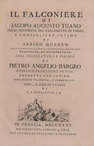 Il falconiere… Venise, Giambatista Albrizzi, 1735. In-4, 21,5 x 28 cm, 20 ff., 216 (sur 224) pp., 50 pp., 9 ff., 1 pl., vélin ivoire (reliure de l’époque). Première traduction italienne, en regard du texte latin, du poème de De Thou sur la fauconnerie.