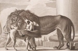 Histoire du lion de la ménagerie du Muséum national d’histoire naturelle et de son chien. Paris, Cuchet, 1794-1795. In-12, 13,5 x 20,5 cm, 40 pp., demi-maroquin orange à coins, dos orné de faux-nerfs dorés, tête dorée (reliure postérieure). Édition originale. Ouvrage sur le lion Woira et le chien braque donnés au Muséum en 1794. Frontispice gravé en manière noire.
