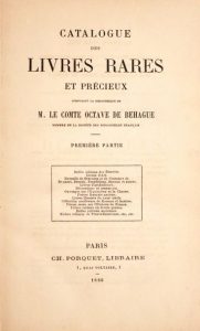 Catalogue des livres rares et précieux composant la bibliothèque de M. le comte Octave de Behague, membre de la Société des bibliophiles français. Paris, Ch. Porquet, 1880. 2 tomes en un volume in-8, 16 x 24,5 cm, XXIV + 358 pp. & VIII + 264 pp., demi-chagrin rouge, dos à nerfs (reliure de l’époque). Catalogue de la vente Behague. 2150 numéros, dont 24 sur la chasse.