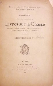 – Catalogue d’une jolie collection de livres sur la chasse, escrime, duel, équitation, gymnastique, pêche, danse, vie à la campagne, composant la bibliothèque de Mr… Paris, A. Durel, 1890. In-8, 16 x 24,5 cm, 104 pp., demi-percaline beige à la Bradel, couvertures (cartonnage moderne). Catalogue de la vente Lebreton. 727 numéros.