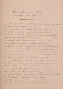 Vers 1875. Manuscrit in-4, 19,5 x 25,8 cm, 127 ff., demi-chagrin vert à coins (reliure de l’époque). Recueil manuscrit de 18 pièces en vers sur la chasse : Cretin, Ronsard, Jodelle, Binet, Baïf, Habert, Du Sable, La Fontaine, Molière, Delille, Parny, Deslandes, etc.