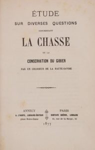 Étude sur diverses questions concernant la chasse et la conservation du gibier, par un chasseur de la Haute-Savoie. Annecy, A. L’Hoste & Paris, G. Guérin, 1877. In-8, 13,5 x 20,5 cm, 84 pp., demi-percaline marron glacé à la Bradel (cartonnage de l’époque). Unique édition rare.