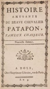 Histoire amusante du brave chevalier Patapon, fameux chasseur. Dole, 1801. In-12, 9 x 16,5 cm, 46 pp., …