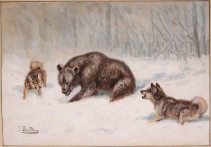 L’ours brun, roi de la forêt. Paris, Stock, 1934. In-8, 19 x 20 cm, 222 pp., 1 f., 6 pl., demi-veau fauve à coins, dos à nerfs, tête dorée, couvertures et dos, non rogné (reliure postérieure). Édition de luxe, illustrée de compositions de J. Oberthür et d’É. Mérite, dont 6 hors-texte.