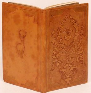 Chasse au cerf en Écosse. [1901]. Manuscrit in-8, 15 x 24 cm, 1 f. blanc, 22 ff. dont 3 repliés, 43 ff. blancs, veau fauve, large motif de chardons pyrogravé sur le premier plat, cerf pyrogravé sur le second plat, dos lisse, non rogné (reliure de l’époque). Recueil de 21 dessins humoristiques à la plume légendés en anglais, sur papier vergé.