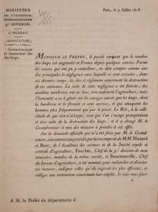 Instruction pour la destruction des loups. Paris, Ministère de l’intérieur, 1818. Petit in-4, 17,5 x 23 cm, 16 pp., cartonnage en papier à la Bradel (Mercier) Rare instruction du ministre de l’intérieur, le vicomte Lainé, adressée aux préfets sous la Restauration par le bureau de l’agriculture, afin de lutter contre les loups par la motivation des lieutenants de louveterie, le versement de primes et l’organisation de chasses et de battues. Bibliographie in fine.