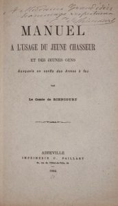 Manuel à l’usage du jeune chasseur et des jeunes gens auxquels on confie des armes à feu.— Conseils au jeune propriétaire de chevaux. Abbeville, impr. C. Paillart, 1884 & 1891. 2 ouvrages en un volume in-8, 14,5 x 23,5 cm, 54 pp. & 52 pp., 1 f., demi-chagrin vert, dos à nerfs, couvertures (reliure de l’époque). Éditions originales.