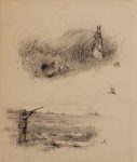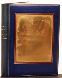 La Picardie et ses chasses. En appendice : La faune et l’avifaune en Picardie. Quelques plans de hutte. Paris, Nouvelles Éditions de la Toison d’Or, 1947. in-4, 19,5 x 26 cm, 226 pp., 1 f., 10 pl. + suite de 14 pl., maroquin bleu, cuivre incrusté dans le premier plat, dos à nerfs, encadrement intérieur de maroquin, tranches dorées, couvertures et dos, étui (Mercher). Édition originale, illustrée de compositions de B. Riab, dont 10 hors-texte.