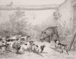 du Journal des chasseurs. Collection de 24 sujets de chasse et de courses avec fanfares nouvelles Paris, Journal des chasseurs, 1840-1842. In-4 oblong, 34,5 x 26 cm, 1 f., 24 pl., 7 ff., velours vert (cartonnage de l’époque). Belle suite de 24 lithographies parues dans le Journal des chasseurs, certaines montées, complétée par 6 ff. gravés de fanfares.