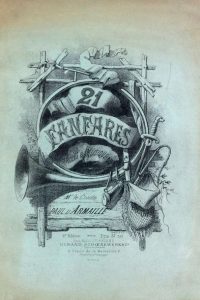 21 fanfares. Paroles & musique. Paris, G. Flaxand, vers 1870. In-4, 19 x 28,5 cm, 24 ff., papier gris marbré, couvertures (cartonnage de l’époque). Édition en partie originale tirée à petit nombre et entièrement lithographiée. Très rare.