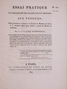 Essai pratique sur quelques-unes des maladies les plus ordinaires aux veneurs. Thèse présentée et soutenue à la faculté de médecine de Paris, le 3 décembre 1827… Paris, impr. Didot le Jeune, 1827. In-4, 20 x 25 cm, 22 pp., demi-chagrin brun, dos lisse (reliure postérieure). Édition originale très rare.