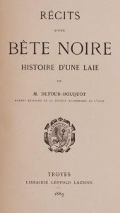 Récits d’une bête noire. Histoire d’une laie. Troyes, Librairie Léopold Lacroix, 1889. In-4, 17 x 25 cm, 24 pp., demi-percaline beige à la Bradel à coins, couvertures (cartonnage moderne). Tiré à part rare de ce récit de chasse à courre d’une laie.