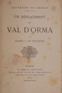 Un déplacement au val d’Orma. Souvenirs de chasse. Paris, E. Dentu, 1877. In-12, 12,5 x 19 cm, 142 pp., 1 f., demi-chagrin rouge à coins, dos à nerfs (reliure postérieure). Édition originale.