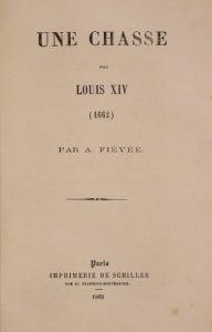 FIÉVÉE (A.). Une chasse sous Louis XIV (1662). Paris, impr. Schiller, 1862. In-8, 15 x 23 cm, 2 ff., 56 pp., …