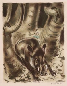 La dernière harde. Paris, Vialetay, 1953. in-folio, 25 x 32 cm, 320 pp., 4 ff., demi-maroquin orange à coins, dos à nerfs, tranches dorées, couvertures et dos, étui (Mercher). Belle édition tirée à 316 exemplaires, illustrée de bois gravés d’André Margat.