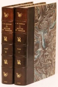 Les meuttes et véneries. Paris, Damascène Morgand, 1892. 2 volumes in-4, 20,5 x 25,5 cm, 2 ff., XXII pp., 5 ff., 466 pp., 1 f. & 2 ff., 422 pp., 1 f., XLVIII pp., 1 f., demi-veau noir, dos à nerfs ornés de motifs cynégétiques dorés, têtes dorées, couvertures et dos (reliure postérieure). Première édition complète, en très grande partie originale, de l’« un des meilleurs écrits cynégétiques du XVIIe siècle » (Thiébaud) : vénerie du cerf, du sanglier, du lièvre et du chevreuil.