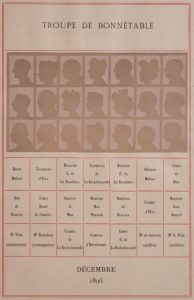 Shooting and hunting. Revue en deux actes représentée au château de Bonnétable le 20 décembre 1896. [Le Mans, typographie Edmond Monnoyer, 1896]. In-4, 16,5 x 25 cm, 2 ff., 70 pp., 1 f., 1 pl., demi-percaline rouge à coins, fer cynégétique doré sur le premier plat, couvertures, tête dorée (cartonnage de l’époque). Édition originale de cette pièce de circonstance, tirée à très petit nombre, non mis dans le commerce. Illustré d’une planche représentant la troupe de Bonnetable, avec une photographie originale montée.