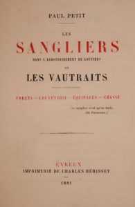 PETIT (Paul). Les sangliers dans l’arrondissement de Louviers et les vautraits… Évreux, Ch. Hérissey, 1881. …