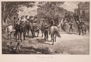 Le chapeau de la femme à la chasse. Paris, impr. A. Porcabœuf, 1909. In-plano oblong, 53 x 35 cm, 3 ff., 8 pl., demi-chagrin noir (reliure de l’éditeur). Belle suite de 8 eaux-fortes, tirée à 400 exemplaires numérotés.