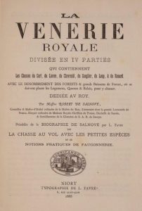 SALNOVE (Robert de). La vénerie royale… Niort, L. Favre, 1888. In-4, 22 x 28 cm, 2 ff., XXX pp., 1 f., 260 pp., 1 f. …
