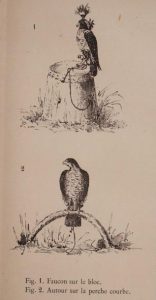 Précis de fauconnerie… suivi de L’éducation du cormoran. Niort, L. Clouzot, 1887. In-8, 13,5 x 22 cm, 2 ff., 124 pp., 4 pl., basane fauve marbrée à coins, dos à nerfs, couverture, non rogné (reliure postérieure). Unique édition, illustrée de 4 planches.
