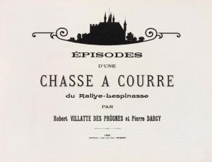 Épisodes d’une chasse à courre du Rallye-Lespinasse. Montluçon, impr. J. Maugenest, 1902. In-folio oblong, 35 x 26,5 cm, 2 ff. blancs, 13 ff., 1 f. blanc, percaline bleue, titre doré sur le premier plat (cartonnage de l’époque). Édition originale tirée à 50 exemplaires numérotés. Illustrations en ombres chinoises.