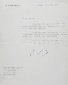 Lettre signée « C. de Gaulle », adressée à Albert Laprade. Paris, 28 octobre 1958 ; 1 page in-4° sur papier gravé à son nom.