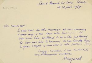 Carte autographe signée, adressée à A. Laprade. Saint-Benoit-sur-Loire, 20 juin 1939 ; 1 page in-12 oblongue.