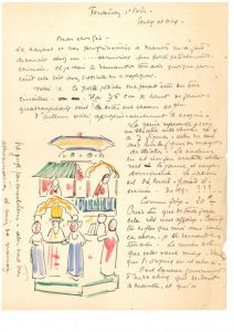 approximativement le croquis. La scène représente je crois un théâtre indochinois . Il y a 7 figures [...] avec sur la figure des masques de théâtre. La couleur en est un peu brutale et le vert, le jaune et rouges dominent. Le poids en est très lourd - paraît-il - environ 30 Kg ??? Comme prix 20 F. Crois-tu que de toute façon, cela soit une affaire. Comme tu es plus que moi versé dans choses, je te demande ton avis. Le mien est que cela vaut mieux - d'autant que l'origine en est celui-ci. C'est l'ancien gouvernement d'Indochine qui résidait à Mantes et qui a dispersé ses collections. L'armurier a acheté cela et n'en veux plus. J'ignore si c'est ancien ancien mais tout de même la patine des couleurs et des or me paraît de pas être complètement moderne. »