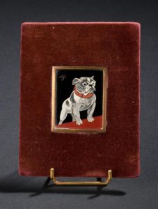 Plaque d'émail rouge noir et blanc gravé en intaille, monogrammé en haut à gauche.
