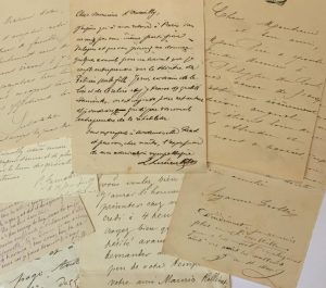 Ensemble de 14 documents (lettres ou cartes) adressés à Barbey d'Aurevilly. Formats divers.
