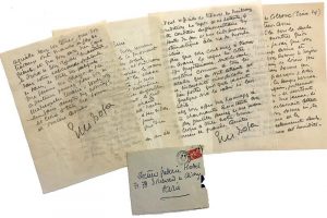 - Gros Mesnil par St Romain de Colbosc ; 2 pages in-4°. « Cette adresse est là pour la seule décoration et vous montrer qu'on n'est pas à Paris. Je sais que vous n'aimez pas beaucoup écrire et veux seulement vous donner le bonjour pendant que je suis de loisir pour le faire. Je nous suis donné un mois de détente parce que j'avais beaucoup travaillé, ces temps derniers, pour faire mon bouquin, justement dans cette intention, et surtout parce que la grippe de ma femme, si grippe il y a eu, réclamait cette convalescence. Nous sommes ici, de par le temps, l'époque et les circonstances, merveilleusement seuls dans le calme, le silence et l'humidité. »