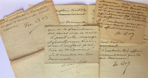 Lettre autographe signée, adressée à M. Duvernoy. Paris, le 24 octobre 1847 ; 3 pages in-8°, enveloppe jointe. « Mes chansons ne sont point à moi, Monsieur, mais à mon éditeur, qui n'aime pas trop qu'on lui emprunte quelques unes pour les marchands de musique. C'est pourtant un homme fort généreux, ainsi ne fait-il pas de ces marchés dont vous parlez. C'est à dire qu'il ne veut pas mes couplets en détail [...]. Quant à moi, Monsieur, je raisonne différemment, non que je vende non plus mais j'aime assez que des hommes de talents veuillent bien faire l'honneur à mes paroles de les mettre en valeur par des compositions musicales nouvelles. J'en suis même reconnaissant. S'il vous convient donc de publier deux ou trois des chansons que vous dites avoir enrichi de vos notes, faites-le, Monsieur, et en disant que je vous