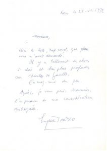 Lettre autographe signée. 22 juillet 1972 ; 1 page in-4°.