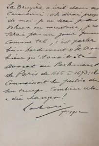 Pièce autographe signée. Septembre 1912 ; 1 page in-8° sur une page de livre d'or. « La Bruyère a écrit dans ses "Caractères" : « Je dirai presque de moi : je ne serai pas voleur ou meurtrier ; je ne serai pas un jour puni comme tel, c'est parler bien hardiment. » Je crois bien qu'il avait été avocat au Parlement de Paris de 1665 à 1673 : il connaissait la justice de son temps. Combien cela a dû changer ! Labori. »