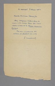 Lettre autographe signée, adressée à M. Hirsch fils. 3 mars 1954 ; 1 page in-8°. « Ayez l'obligeance faire faire la remise à Monsieur Jacques Nam qui vient acheter le tome II du Théâtre Maurice Boissard. Tous mes compliments bien amicaux en attendant ma visite. »