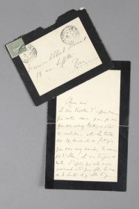 Lettre autographe signée, adressée à Albert Flament. [22 juillet 1904] ; 1 page 1/2 in-12 sur papier de deuil, amorces de fente au pli. Enveloppe timbrée jointe avec adresse autographe.