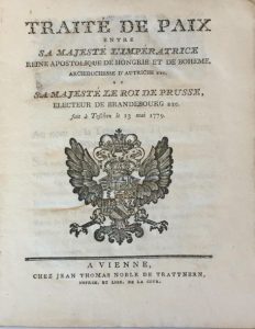 Imprimé. « Traité de paix entre Sa Majesté l'Impératrice, reine apostolique de Hongrie et de Bohème, archiduchesse d'Autriche, etc. et sa Majesté le Roi de Prusse, Electeur de Brandebourg, etc. fait à Teschen le 13 mai 1779. »