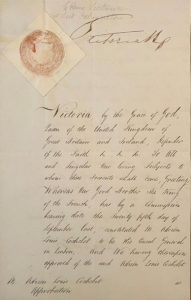 Pièce signée « Victoria » en tête du document, signée par Lord Palmesrton en fin du document. 2 pages in-folio (32 x 20,5 cm), en anglais. Sceau aux armes royales sous papier. Approbation pour M. Cochelet pour exercer sa fonction de Consul général.