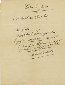 Lettre autographe signée, adressée au docteur Hodel. « Londres, le jeudi » ; 1 page in-4°. « Je suis retenu à Londres, peut-être jusqu'à samedi soir. Aussitôt à Paris, je vous téléphone pour vous prier d'excuser le rendez-vous de vendredi. »