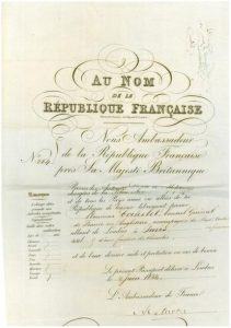 - Pièce signée, comme ambassadeur de la République française près Sa Majesté Britannique. Passeport en faveur de M. Cochelet. 2 juin 1852. 42,5 x 26,5 cm.