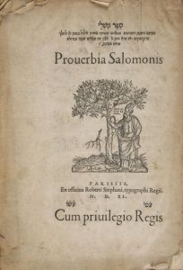 [BIBLE HEBRAIQUE] - Proverbia Salomonis. Paris, Robert Estienne, 1540. In-4, 56 pp. chiffrées en hébreu dont dernier feuillet blanc. , Sans reliure.