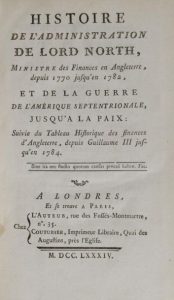 HILLIARD D'AUBERTEUIL, Michel René - Histoire de l'administration de Lord North, ministre des finances en Angleterre, depuis 1770 jusqu'en 1782, et de la guerre de l'Amérique septentrionale, jusqu'à la paix : suivie du Tableau historique des finances d'Angleterre, depuis Guillaume III jusqu'en 1784. Londres, Paris, chez l'auteur, chez Couturier, 1784. 3 parties en un vol. in-8, XX, 276 pp. ; (4) 180 pp. ; 80 pp., carte dépl., veau fauve gran. de l'ép., dos lisse orné, coins émoussés.
