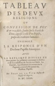 LA FITE, Jean de - Tableau des deux religions ou Confession de foy d'un vrai fidele, fondée sur la Parole de Dieu ; opposée à celle d'un Papiste, puisée des traditions humaines. Ensemble la responce d'un Docteur Papiste Anonyme. Avec la réplique divisée en deux partie. La première contenant la Deffence de la confession de foy du vrai fidèle. La seconde, la réfutation des erreurs de la Papauté, contre la Responce du Docteur Papiste. S. l., 1623. In-8, (16) ff., 394 pp., (3) ff., papier jauni, mouill. claires, qqs. gal. de vers sur la marge int. avec perte de lettres, vélin souple de l'ép.